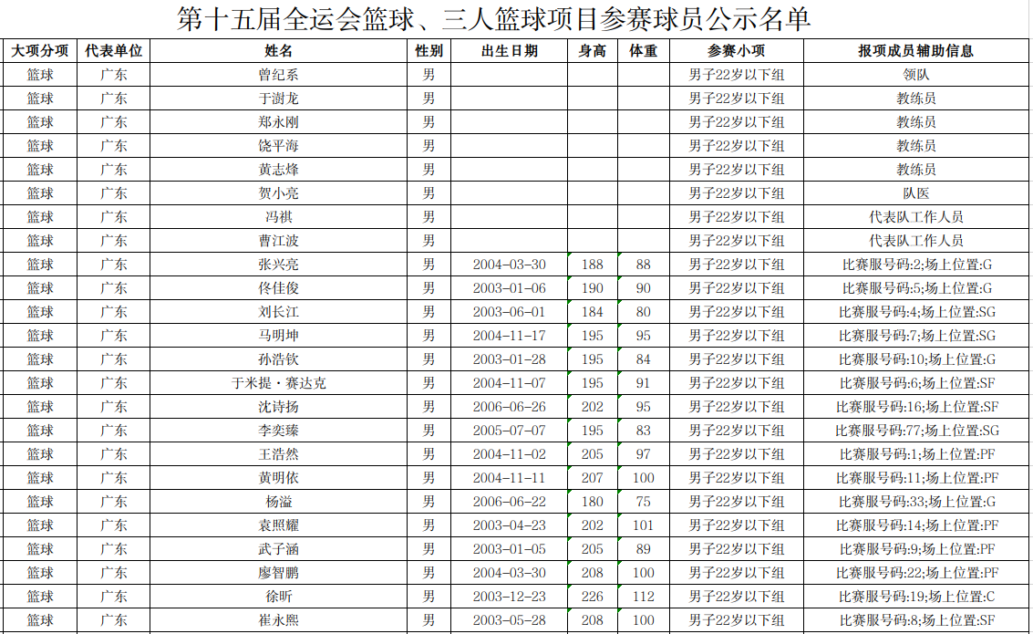 中国篮球协会今天公示第十五届全国运动会篮球项目决赛阶段球员名单,崔永熙、徐昕将代表广东队参加22岁以下组比赛。